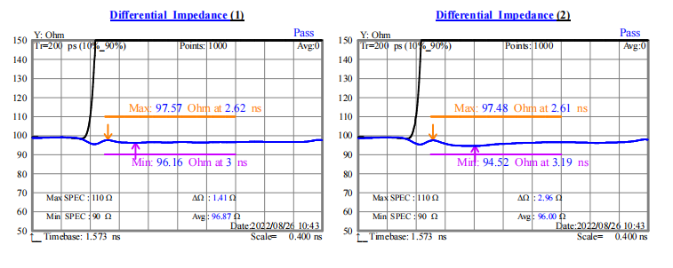 從圖一與圖二數(shù)據可以看出,不貼復合鋁箔,排線的特性阻抗平均值為114.6Ω和113.4Ω;貼上復合鋁箔后排線的特性阻抗平均值為96.8Ω和96Ω。而一般都要求線纜特性阻抗在100±10Ω。下圖七與圖八是不貼復合鋁箔與貼上復合鋁箔排線的特性阻抗圖,顯然貼上復合鋁箔后特性阻抗的波動范圍更小,且能控制在標準范圍內。